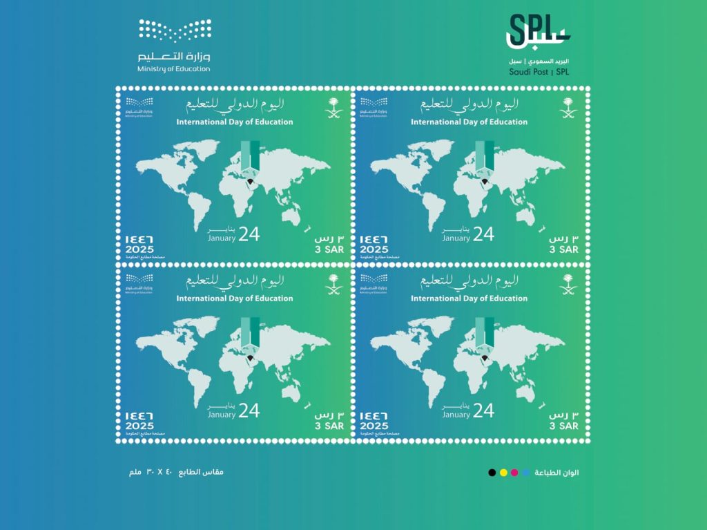 أصدرت مؤسسة البريد السعودي “سبل” بالتعاون مع وزارة التعليم طابعًا تذكاريًا بقيمة (3) ريالات بمناسبة اليوم الدولي للتعليم 2025.
