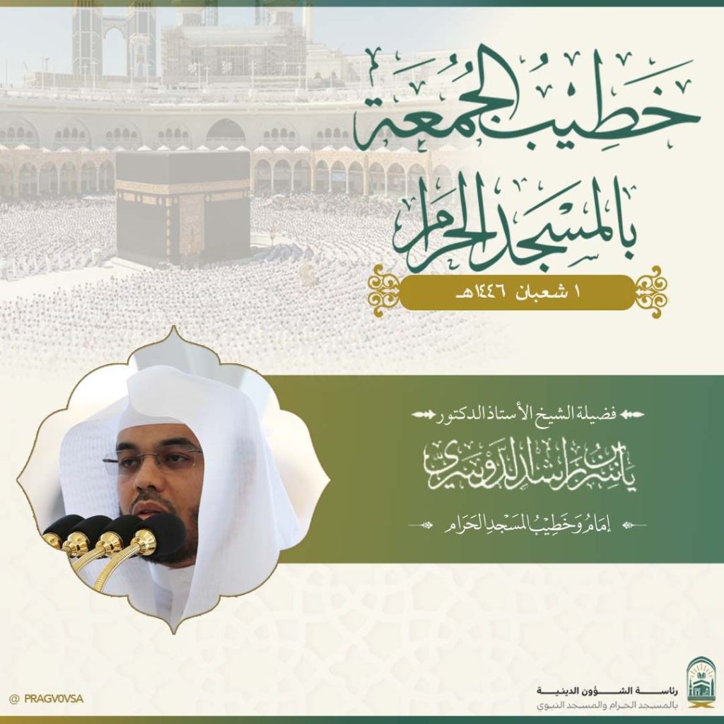 حددت رئاسة الشؤون الدينية بالحرمين الشريفين خطيبا يوم بعد غد الجمعة الأول من شهر شعبان 1446 هجرية، بالمسجد الحرام والمسجد النبوي