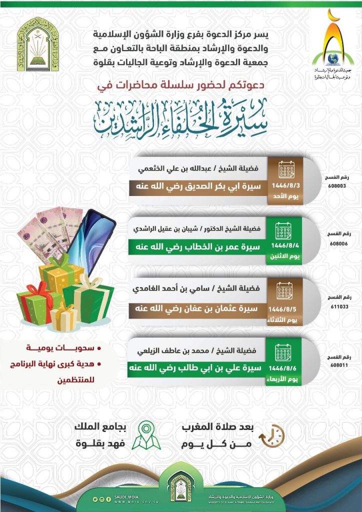 في إطار جهوده الدعوية والتوعوية، ينظم مركز الدعوة بفرع وزارة الشؤون الإسلامية والدعوة والإرشاد بمنطقة الباحة، بالتعاون مع جمعية الدعوة والإرشاد وتوعية الجاليات بمحافظة قلوة، سلسلة محاضرات يومية عن سيرة الخلفاء الراشدين، وذلك بعد صلاة المغرب في جامع الملك فهد بقلوة، خلال الفترة من الأحد 1446/8/3هـ إلى الأربعاء 1446/8/6هـ، بمشاركة نخبة من المشايخ.