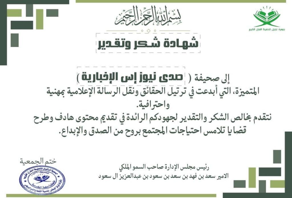 في لفتة كريمة تجسد التقدير الكبير لدور الإعلام في دعم المبادرات الوطنية والمجتمعية، حظيت صحيفة صدى نيوز S بتكريم خاص من صاحب السمو الملكي الأمير سعد بن فهد بن سعود بن عبدالعزيز آل سعود – حفظه الله – حيث منح سموه الصحيفة شهادة فخرية تقديرًا لعطائها الإعلامي وجهودها المتميزة في خدمة المجتمع وإبراز المبادرات الخيرية والتنموية.
