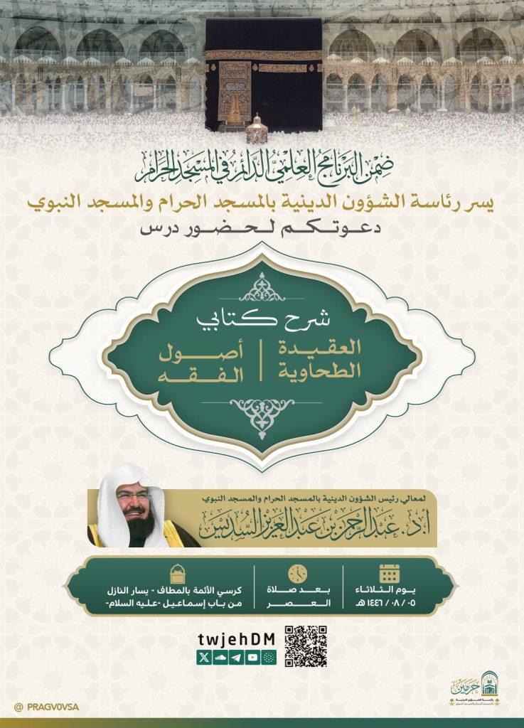 يقام درس “شرح كتابَي العقيدة الطحاوية وأصول الفقه”، والذي يقدمه معالي رئيس الشؤون الدينية بالمسجد الحرام والمسجد النبوي، الشيخ الدكتور: عبدالرحمن السديس
