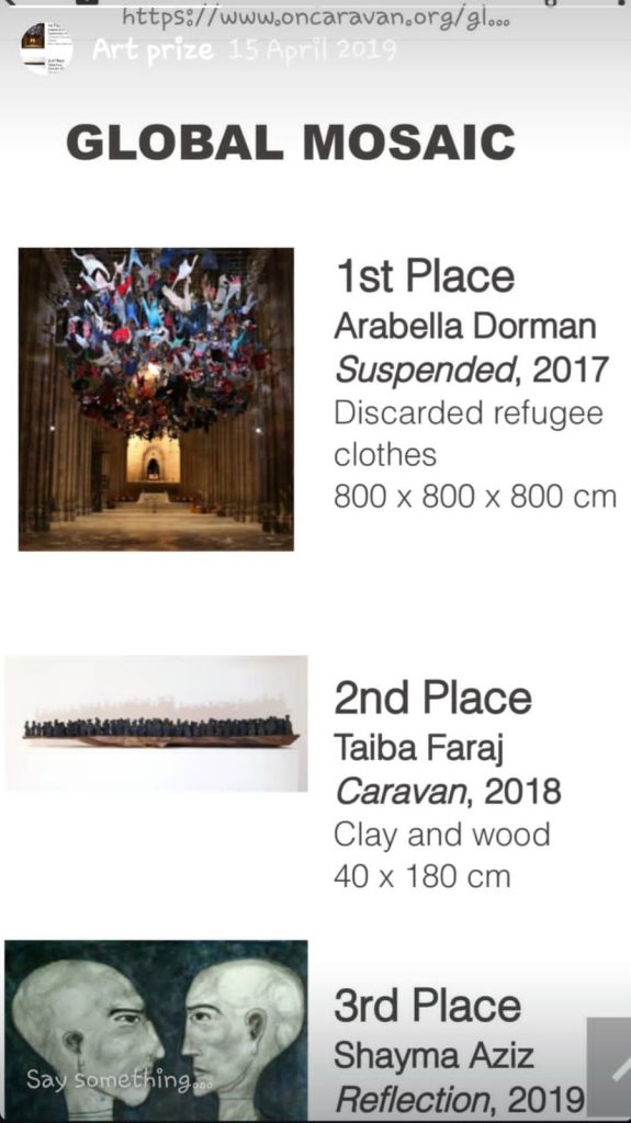 فازت بالمركز الثاني في مسابقة فنية عالمية بعنوان “جلوبال موزاييك” في أبريل ۲۰۱۸ – نظمتها شركة كارافان الفنية في شيكاغو.