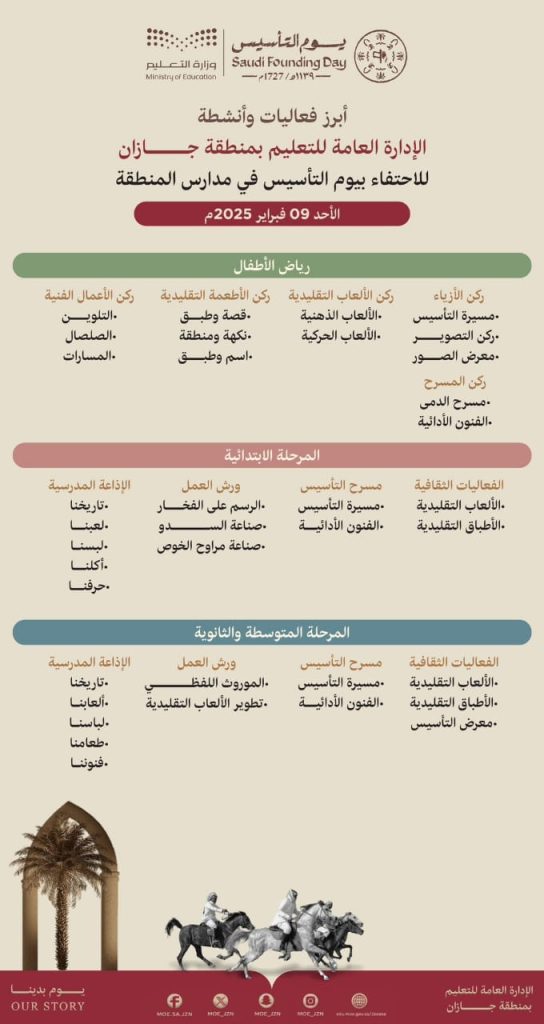 أنهت الإدارة العامة للتعليم بمنطقة جازان استعداداتها للاحتفاء بـ“يوم التأسيس” تحت شعار “يوم بدينا”، وذلك عبر حزمة من البرامج والأنشطة والفعاليات التي ستنفَّذ في مدارس المنطقة خلال الفترة من 9 إلى 20 فبراير الجاري.