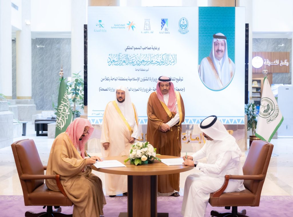 شهد صاحب السمو الملكي الأمير الدكتور حسام بن سعود بن عبدالعزيز، أمير منطقة الباحة ، في بديوان الإمارة اليوم ، وبحضور معالي وزير الشؤون الإسلامية والدعوة والإرشاد الشيخ الدكتور عبد اللطيف بن عبدالعزيز آل الشيخ، توقيع عدداً من اتفاقيات التعاون بين وزارة الشؤون الإسلامية والدعوة والإرشاد ممثله بفرعها بمنطقة الباحة مع كلاً من جامعة الباحة، وأمانة الباحة، وفرع وزارة الموارد البشرية، وفرع وزارة الصحة .