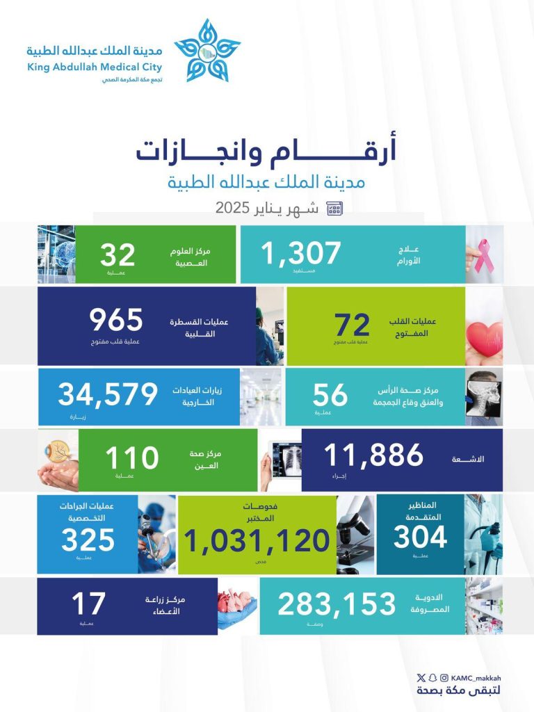 وأوضح تجمع مكة المكرمة الصحي:أنه وفقًا للتقرير الشهري، بلغ عدد المستفيدين من خدمات علاج الأورام 1,307 مستفيدًا، في حين قدم مركز العلوم العصبية 32 عملية جراحية متخصصة. وسجلت المدينة أداءً بارزًا في مجال قسطرة القلب، حيث تم إجراء 965 عملية قسطرة، إلى جانب 72 عملية قلب مفتوح.
