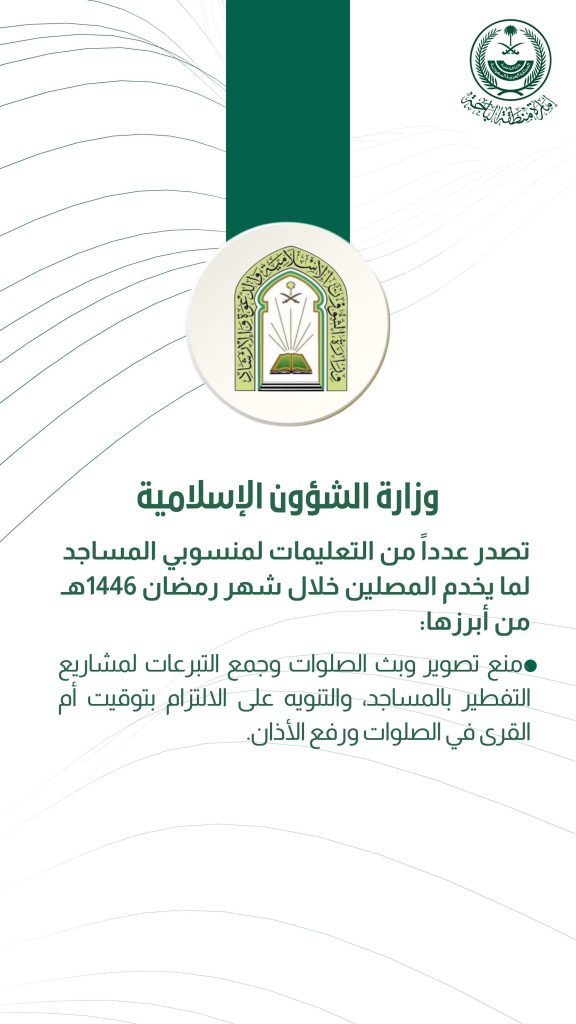 أصدرت وزارة الشؤون الإسلامية عددًا من التعليمات لمنسوبي المساجد لضمان توفير أجواء روحانية للمصلين خلال شهر رمضان المبارك لعام 1446هـ. ومن أبرز التعليمات التي أعلنتها الوزارة: