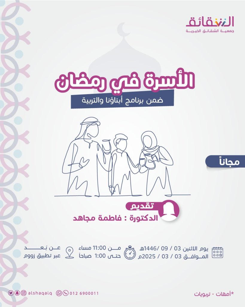 في إطار الاهتمام بتعزيز دور الأسرة في التربية ، تنظم جمعية الشقائق الخيرية لقاءً تربويًا اون لاين عبر منصة الزووم بعنوان “الأسرة في رمضان”، وذلك ضمن برنامج “أبناؤنا والتربية”، بمشاركة الأمهات والمربيات الفاضلات.