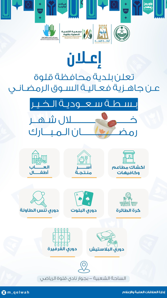 تعلن بلدية محافظة قلوة عن انطلاق فعالية السوق الرمضاني “بسطة سعودية الخير”، التي تجمع بين التسوق، الترفيه، والأجواء الرمضانية المميزة!