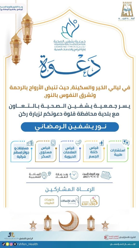 في أجواء رمضانية مفعمة بالخير والعطاء، تُطلق ✧✦ جمعية يشفين الصحية ✦✧، بالتعاون مع ❖ بلدية محافظة قلوة ❖، ركن ❝ نور يشفين الرمضاني ❞، والذي يُقام من يوم ❂ 5- إلى 8 /9 رمضان 1445هـ ❂ بعد صلاة العشاء في ✺ الساحة الشعبية ✺.