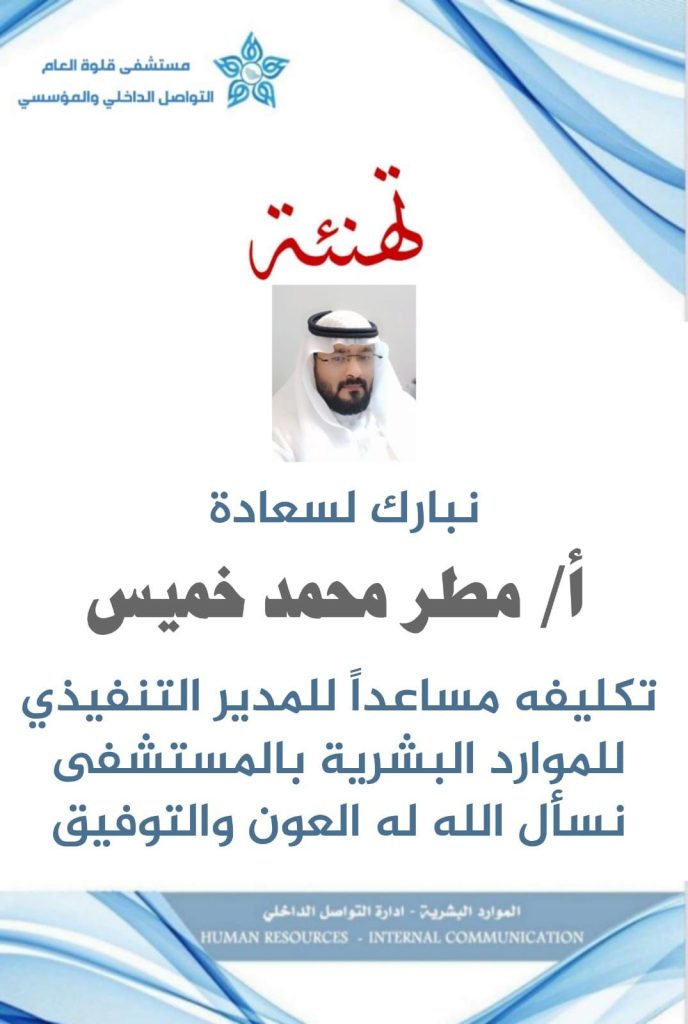 بقلوب يملؤها الفرح والسعادة، وبأجمل عبارات التهنئة والتقدير، نتقدم بأسمى آيات التهاني والتبريكات للأستاذ ✦ صالح أحمد الزهراني ✦ بمناسبة تكليفه مساعدًا للمدير التنفيذي لإدارة المؤشرات بمستشفى قلوة العام، وللأستاذ ✦ مطر محمد خميس ✦ بمناسبة تكليفه مساعدًا للمدير التنفيذي للموارد البشرية.