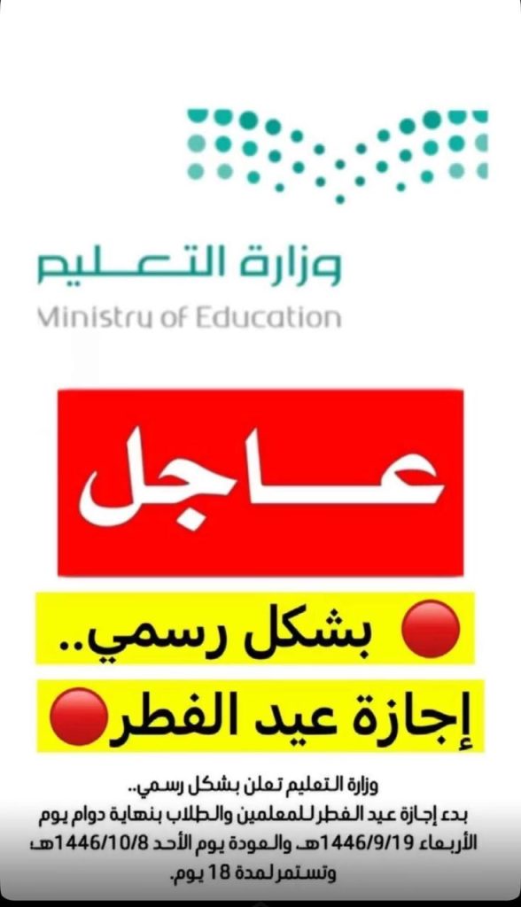 أعلنت وزارة التعليم بشكل رسمي عن موعد إجازة عيد الفطر للمعلمين والطلاب في المملكة. حيث تبدأ الإجازة بنهاية دوام يوم الأربعاء 19 رمضان 1446هـ، على أن تستمر الإجازة لمدة 18 يومًا. وتستأنف الدراسة يوم الأحد 8 شوال 1446هـ.
