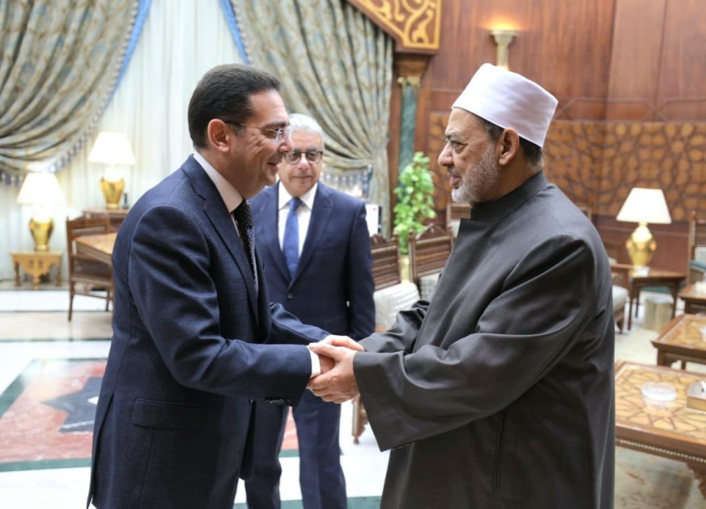 وهنأ فضيلة الإمام الأكبر السفير عماد حنا والسفير إيهاب أبو سريع بمناسبة توليهما مهام تمثيل مصر خارجيًّا، متمنيًا لهما التوفيق والسداد، موصيًا السفيرين بالاهتمام بملف الأزهر الشريف، باعتباره أحد أبرز أدوات القوة الناعمة لمصر، مؤكدًا أن الأزهر على مستعد لتقديم الدعم، عبر توفير البرامج التدريبية للأئمة والوعاظ، من خلال أكاديمية الأزهر العالمية لتدريب الأئمة والوعاظ، لتدريبهم على تفنيد الأفكار المتطرفة.