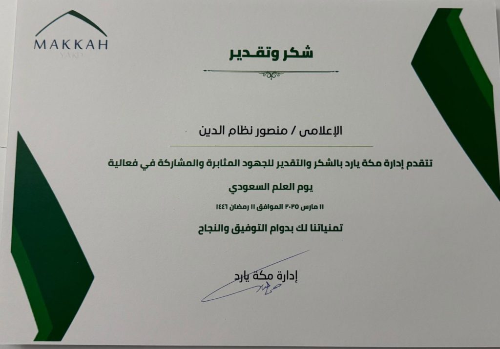 الزميل الأستاذ منصور قريشي – وذلك للجهود المثابرة والمشاركة في يوم العلم السعودي – يوم الحادي عشر من شهر رمضان المبارك الحالي 1446 هجرية – الموافق الحادي عشر من شهر مارس 2025م