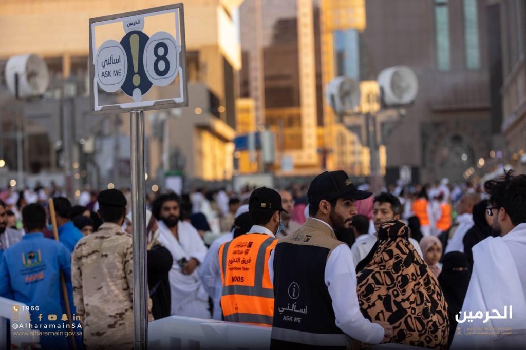 خصصت الهيئة 38 نقطة خدمة ميدانية تحت شعار “اسألني”، تقدم من خلال خدمة الإرشاد (فرق راجلة) للمساعدة في وصول الزوار والمعتمرين إلى وحهاتهم داخل المسجد الحرام والإجابة عن استفساراتهم، ما يسهم في تسهيل حركة التنقل داخل المسجد الحرام. كما تم تعزيز جهود النظافة لضمان بيئة مليئة بالسكينة والطمأنينة، حيث تُنجز عمليات التنظيف خلال 35 دقيقة فقط وفق أعلى معايير الجودة.