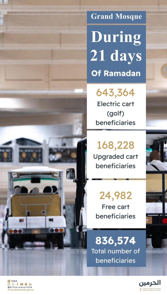 836,574 مستفيدًا من خدمات العربات بـ المسجدالحرام خلال 21 يومًا من رمضان.