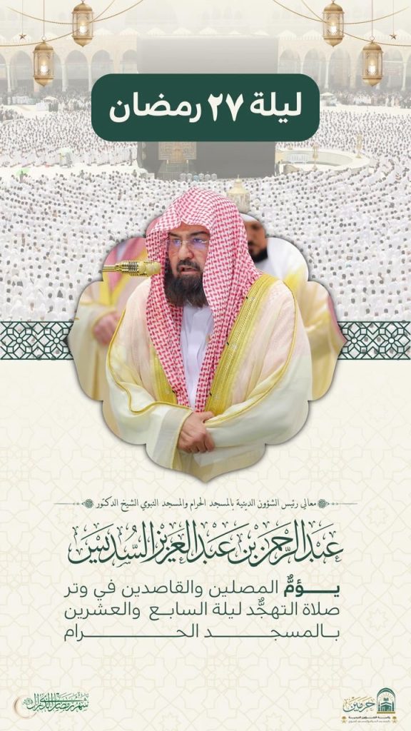 يؤمُّ معالي رئيس الشؤون الدينية بالمسجد الحرام والمسجد النبوي، الشيخ الدكتور: عبدالرحمن السديس، المصلين في وتر صلاة التهجُّد ليلة السابع والعشرين بالمسجد الحرام.