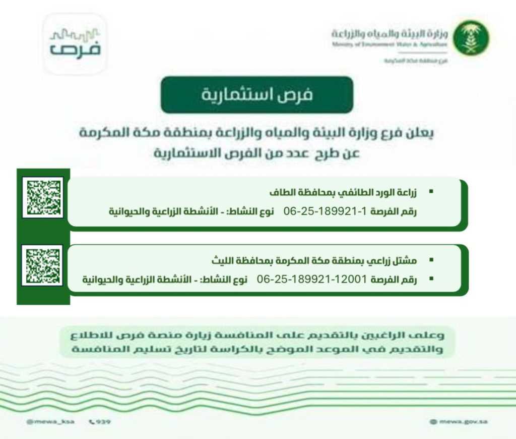 أوضحت وزارة البيئة والمياه والزراعة بفرع منطقة مكة المكرمة عن طرح فرصتين للإستثمار، الأولى إنشاء مشتل زراعي بمحافظة الليث بهدف إنتاج أشجار الفاكهة الأمهات وأشجار الزينة والأشجار البرية وأنواع من الورود، والثانية زراعة الورد الطائفي وإنشاء معمل ومركز للخدمات التسويقية بمحافظة الطائف.