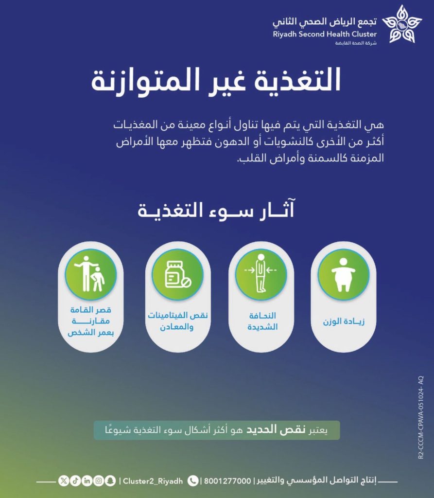 أوضح تجمع الرياض الصحي الثاني من خلال منشور انفوجرافيك سلط الضوء على أضرار التغذية غير المتوازنة وأثرها على صحة الفرد والمجتمع. بهدف نشر الوعي حول أهمية اتباع نظام غذائي متوازن يتضمن تناول جميع العناصر الغذائية اللازمة للحفاظ على صحة الجسم، والتأكيد على خطورة الاعتماد على بعض أنواع الأطعمة على حساب أخرى.
