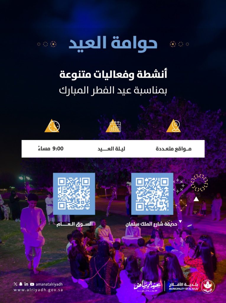 ابتهاجًا بقرب حلول عيد الفطر المبارك، نظمت بلدية الأفلاج مساء اليوم فعالية ( حوامة العيد) بمشاركة الأهالي وزوّار المحافظة، بهدف تعزيز الترابط المجتمعي، والاستمتاع باستقبال العيد وبهجته ، وذلك بالسوق العام و حديقة شارع الملك سلمان