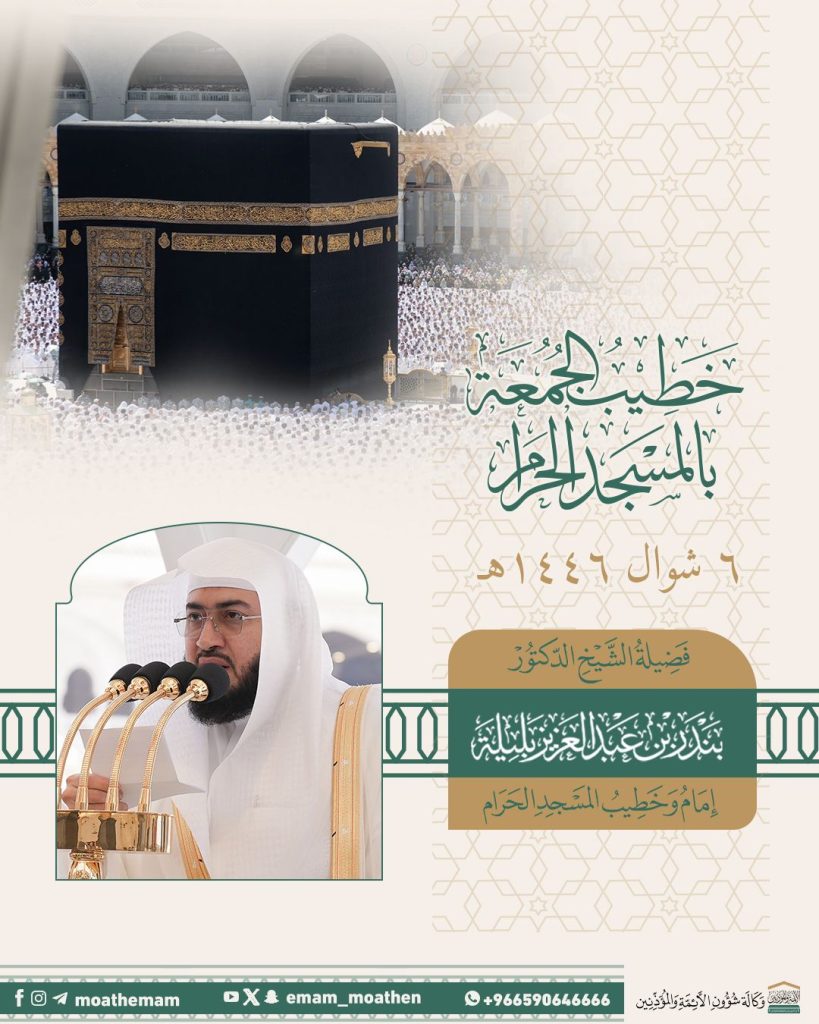 حددت رئاسة الشؤون الدينية بالمسجد الحرام والمسجد النبوي أمام و خطيب يوم بعد غد الجمعة ٦ شوال ١٤٤٦هـ بالمسجد الحرام والمسجد النبوي