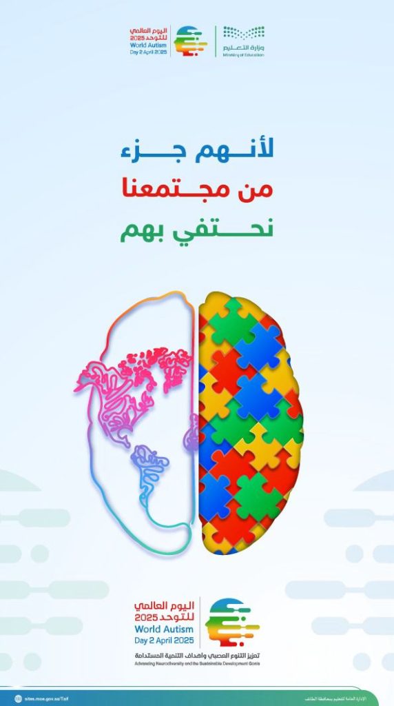 شاركت الإدارة العامة للتعليم في الطائف في الاحتفاء بمناسبة ” اليوم العالمي للتوحد” ، الذي يصادف الثاني من شهر أبريل من كل عام ، من خلال بث رسائل اتصالية عبر حساباتها الرسمية