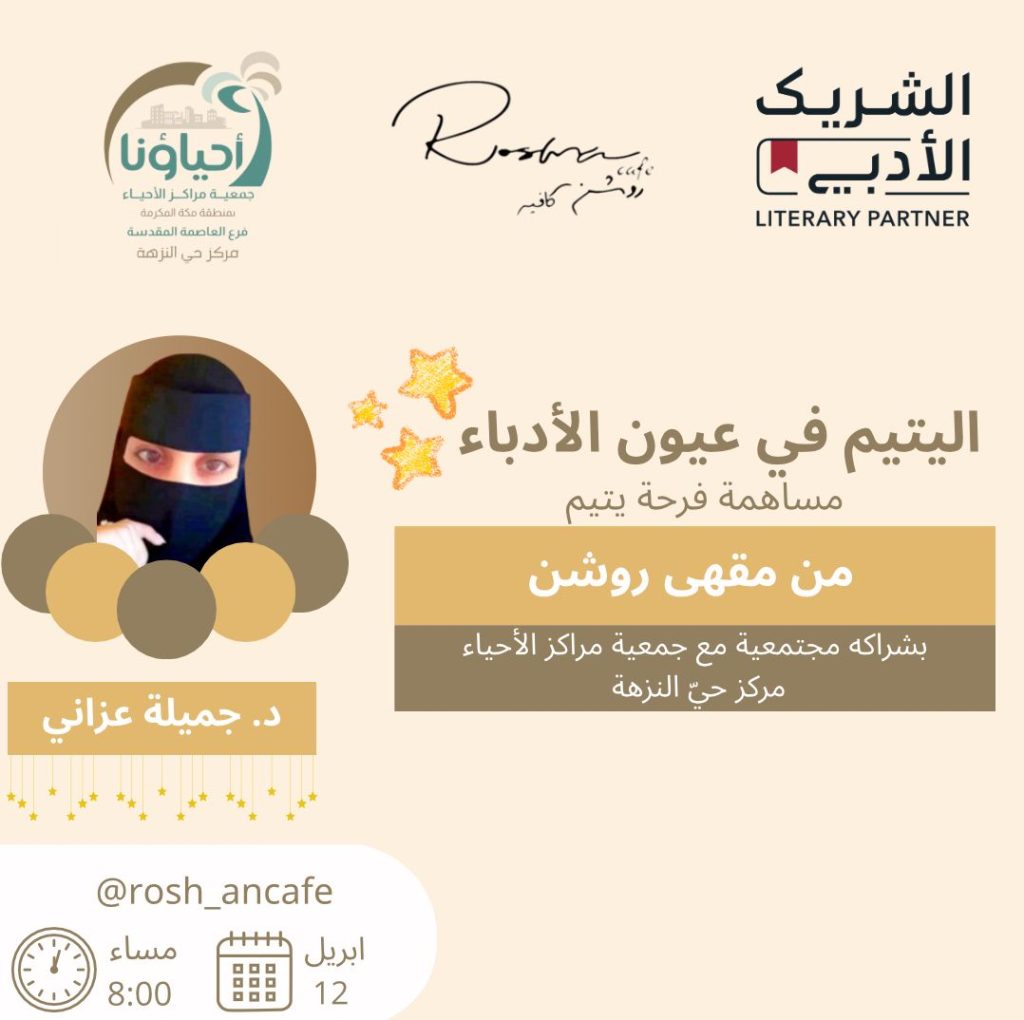 ضمن الأنشطة والبرامج والفعاليات والمبادرات التي يقوم بها مقهى روشن بمكة المكرمة- الشريك الأدبي- لقاء بعنوان ” اليتيم في عيون ألأدباء” وبشراكة مجتمعية مع مركز حي النزهة التابع لجمعية مراكز الأحياء بمنطقة مكة المكرمة بمساهمة نوعيةً “فرحة يتيم”