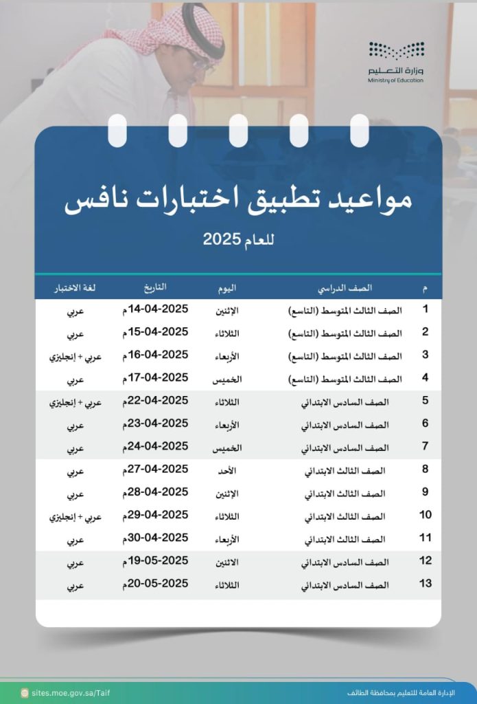 أوضحت الإدارة العامة للتعليم في الطائف مواعيد تطبيق اختبارات نافس للطلاب والطالبات للعام 2025م