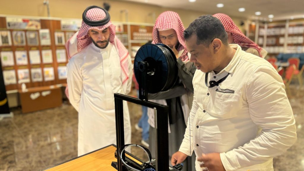 لتدريب 128 طالباً وطالبة وذلك لخلق بيئة تنافسية بين الطلبة في تصميم وطباعة نماذج علمية تحاكي الخيال العلمي وتكون حل للكثير من المشكلات الحياتية في كل المجالات .
