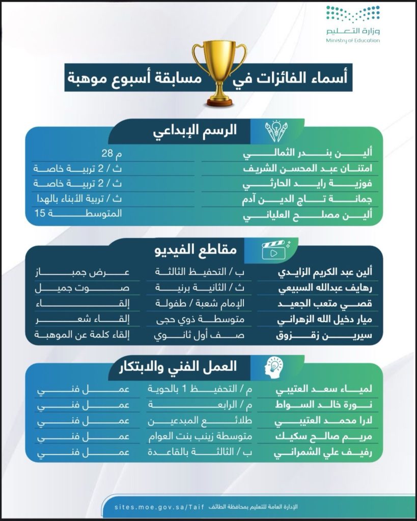 هنأت الإدارة العامة للتعليم بمحافظة الطائف الطلاب والطالبات الفائزين في مسابقة “أسبوع موهبة”،