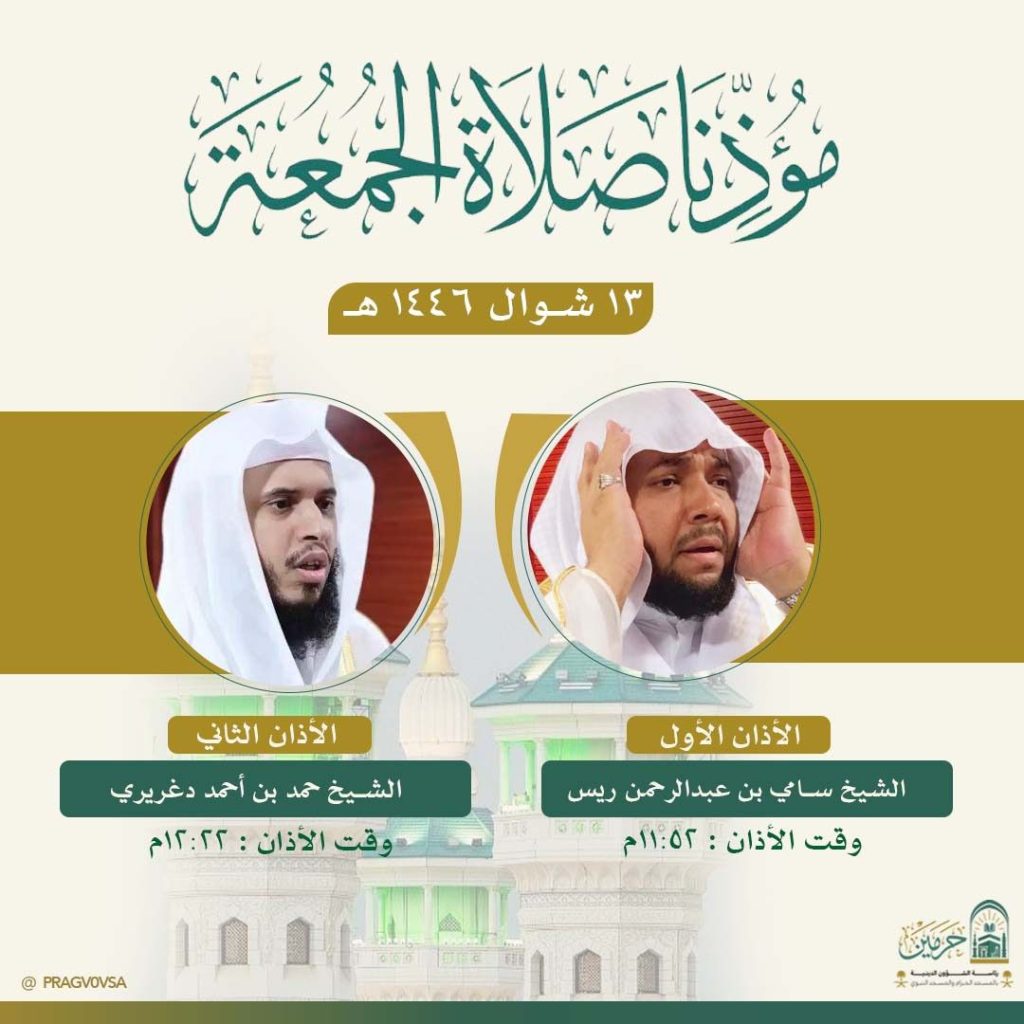 أوضحت رئاسة الشؤون الدينية بالمسجد الحرام والمسجد النبوي، أسماء المؤذنين لصلاة الجمعة القادمة الموافق 13 شوال 1446هـ، وذلك ضمن جهودها المستمرة في تنظيم أوقات الصلاة وإبلاغ قاصدي وزائري الحرمين الشريفين بمواعيد الأذان والمؤذنين المعنيين.