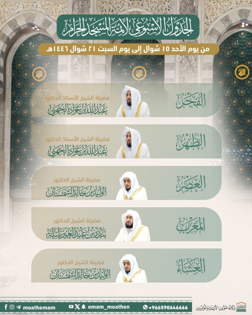أوضحت رئاسة الشؤون الدينية بالمسجد الحرام والمسجد النبوي عن الجدول الأسبوعي لأئمة الحرمين الشريفين، للفترة من يوم الأحد ١٥ شوال وحتى السبت ٢١ شوال ١٤٤٦هـ، وذلك في إطار حرصها على تنظيم الشعائر وتمكين المصلين من أداء صلواتهم في أجواء من السكينة والخشوع.