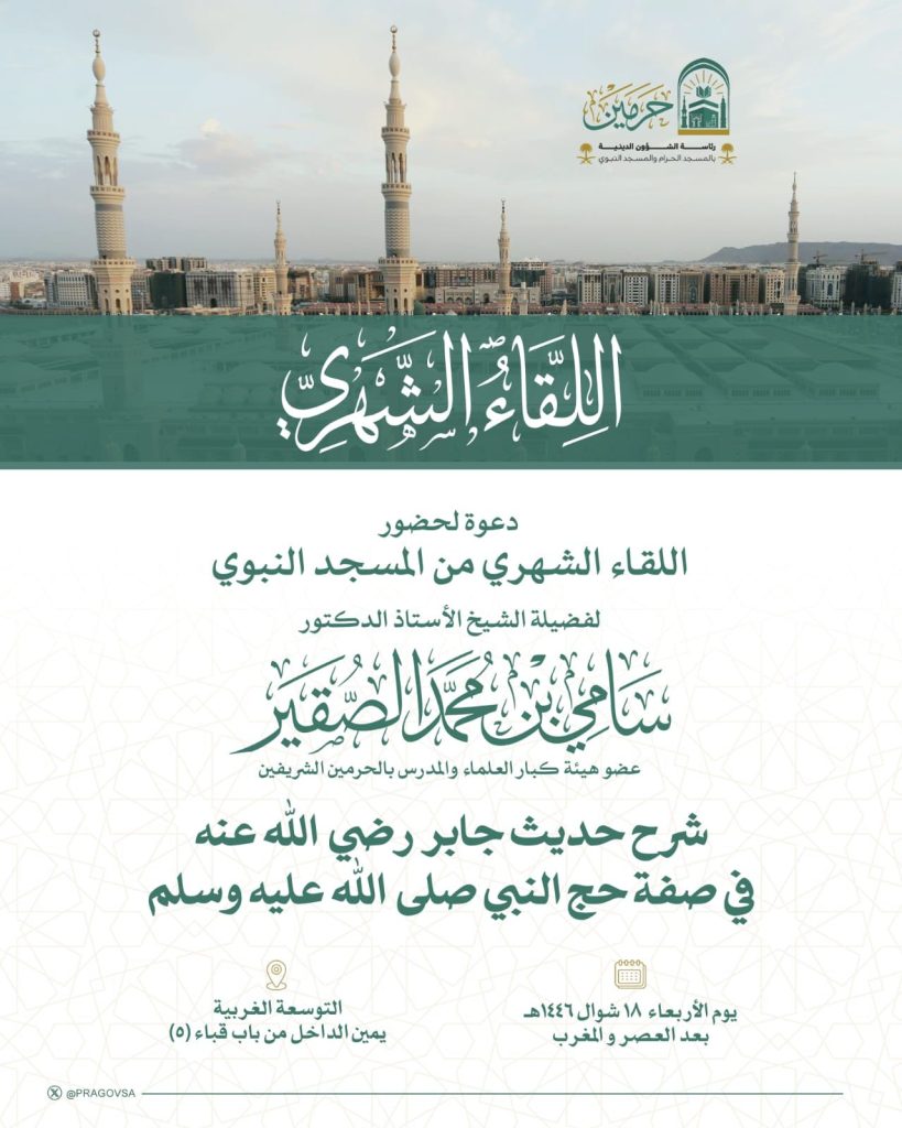 تنظّم رئاسة الشؤون الدينية بالمسجد الحرام والمسجد النبوي درسًا علميًا في رحاب المسجد النبوي الشريف، يقدّمه فضيلة الشيخ الأستاذ الدكتور سامي بن محمد الصقير، بعنوان: