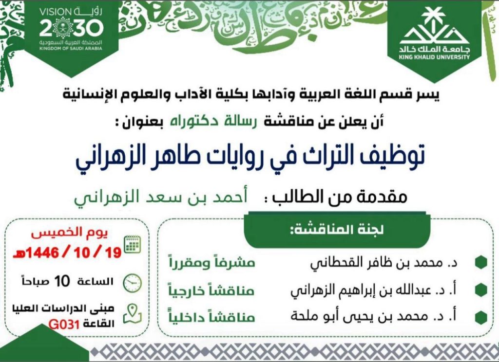 “توظيف التراث في روايات طاهر الزهراني”، وذلك صباح يوم الخميس الموافق 19 / 10 / 1446هـ، في تمام الساعة 10 صباحًا، بـ مبنى الدراسات العليا – القاعة G031.