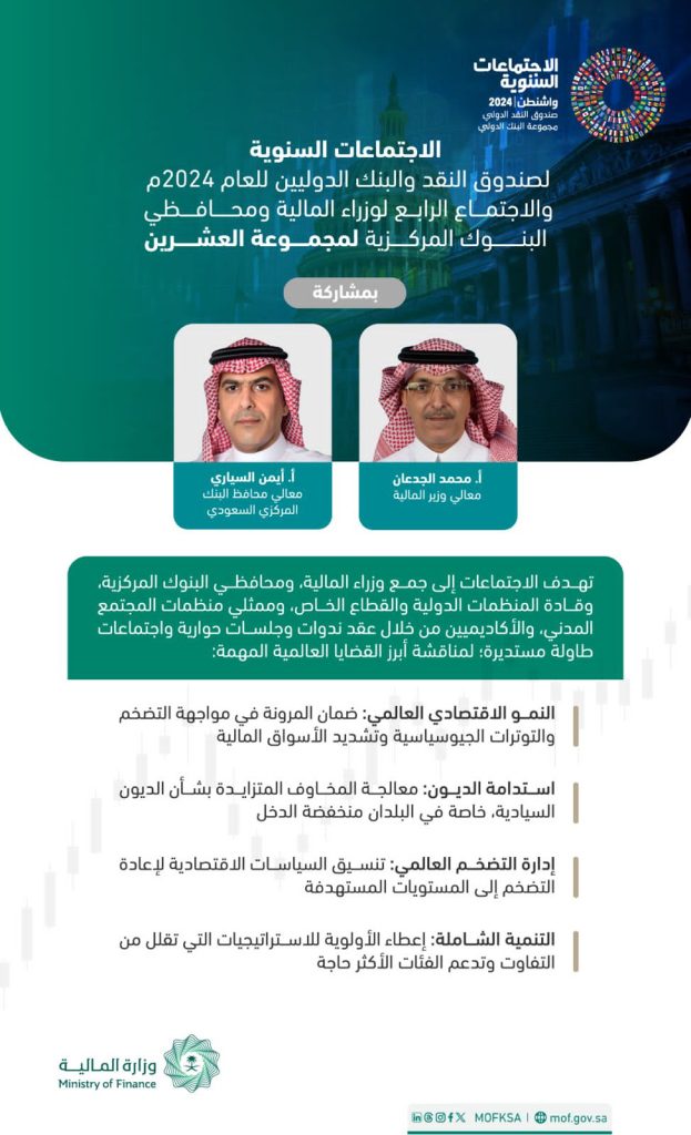 يترأس معالي وزير المالية الأستاذ محمد بن عبدالله الجدعان وفد المملكة المشارك في الاجتماعات السنوية لصندوق النقد والبنك الدوليين للعام 2024م، والاجتماع الرابع لوزراء المالية ومحافظي البنوك المركزية لمجموعة العشرين، والتي تعقد في العاصمة الأمريكية واشنطن خلال الفترة 18-23 ربيع الآخر 1446هـ الموافق 21-26 أكتوبر 2024م.