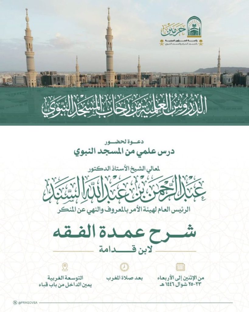 تنظّم رئاسة الشؤون الدينية بالمسجد الحرام والمسجد النبوي درسًا علميًا مميزًا ضمن سلسلة برامجها العلمية المتواصلة، ويُقام في رحاب المسجد النبوي الشريف درس بعنوان: “شرح عمدة الفقه لابن قدامة”، يقدّمه معالي الشيخ الأستاذ الدكتور عبدالرحمن بن عبدالله السند، الرئيس العام لهيئة الأمر بالمعروف والنهي عن المنكر.