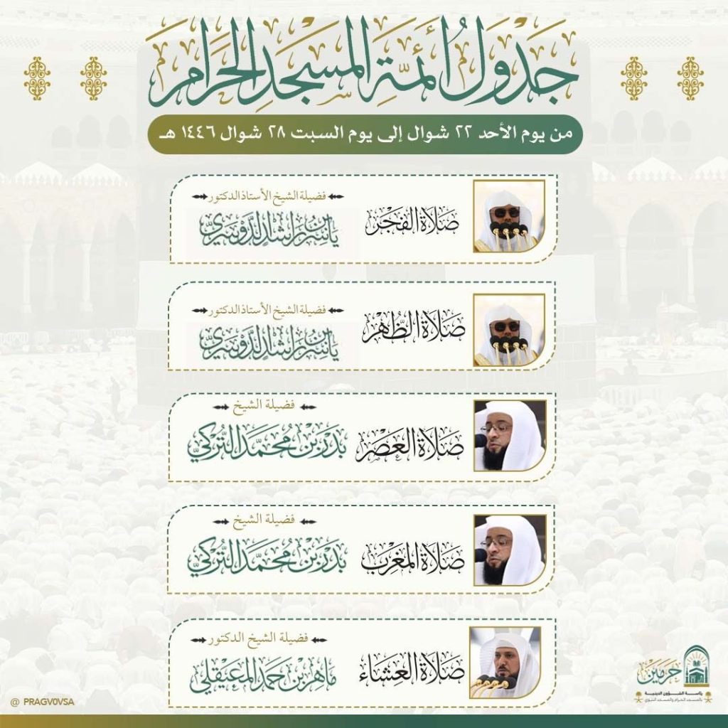 أوضحت رئاسة الشؤون الدينية بالمسجد الحرام والمسجد النبوي عن الجدول الأسبوعي لأئمة الحرمين الشريفين، للفترة من الأحد ٢٢ شوال وحتى السبت ٢٨ شوال ١٤٤٦هـ، وذلك في إطار حرصها على تنظيم الشعائر، وتمكين المصلين من أداء صلواتهم في أجواء من السكينة والخشوع.