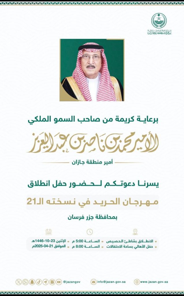 تحت رعاية كريمة من صاحب السمو الملكي الأمير محمد بن ناصر بن عبد العزيز، أمير منطقة جازان، يشهد مساء اليوم الاثنين ٢٣-١٠-١٤٤٦ تدشين فعاليات كرنفال مهرجان الحريد في نسخته الحادية والعشرين.