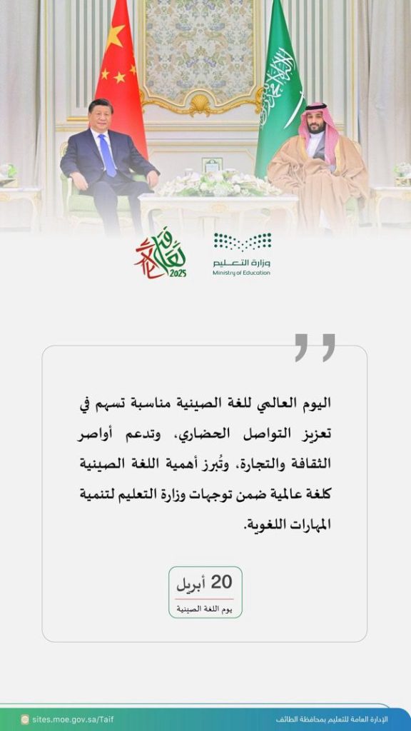 شاركت الإدارة العامة للتعليم بمحافظة الطائف ، في الاحتفاء باليوم العالمي للغة الصينية؛ الذي يصادف 20 أبريل من كل عام.