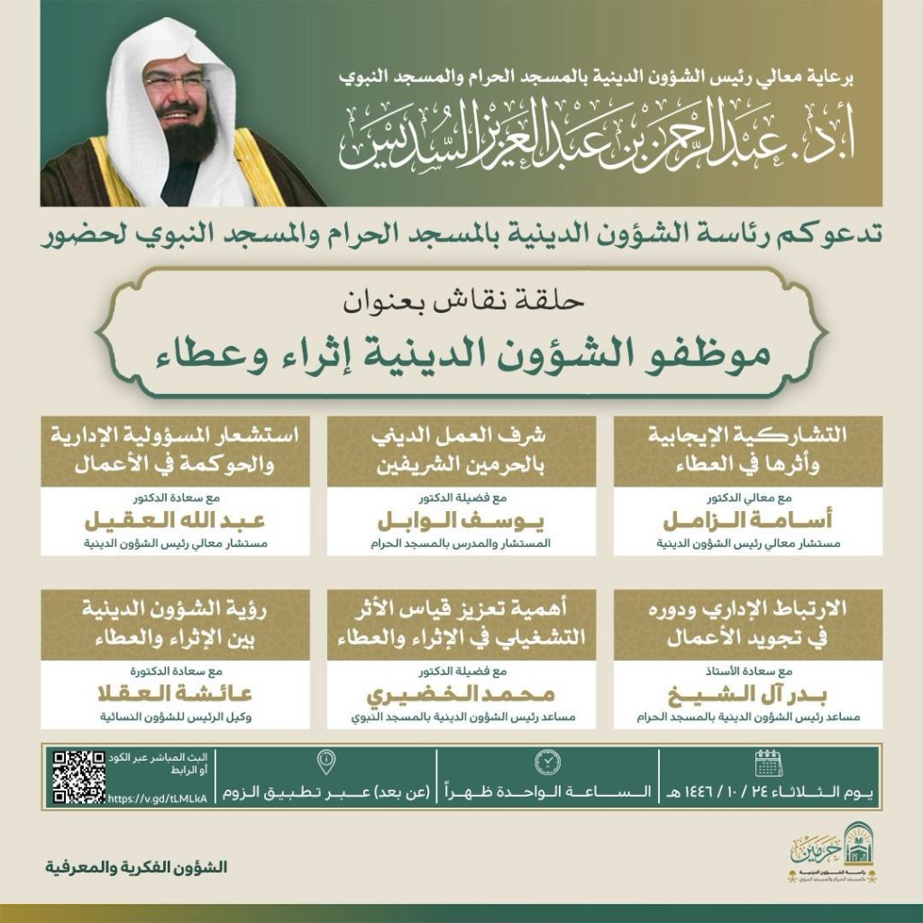 تنظم رئاسة الشؤون الدينية بالمسجد الحرام والمسجد النبوي، يوم الثلاثاء الموافق 24 شوال 1446هـ، حلقة نقاش افتراضية بعنوان “موظفو الشؤون الدينية إثراء وعطاء”، بمشاركة عدد من المنسوبين والمنسوبات المفرغين على ملاك الرئاسة.