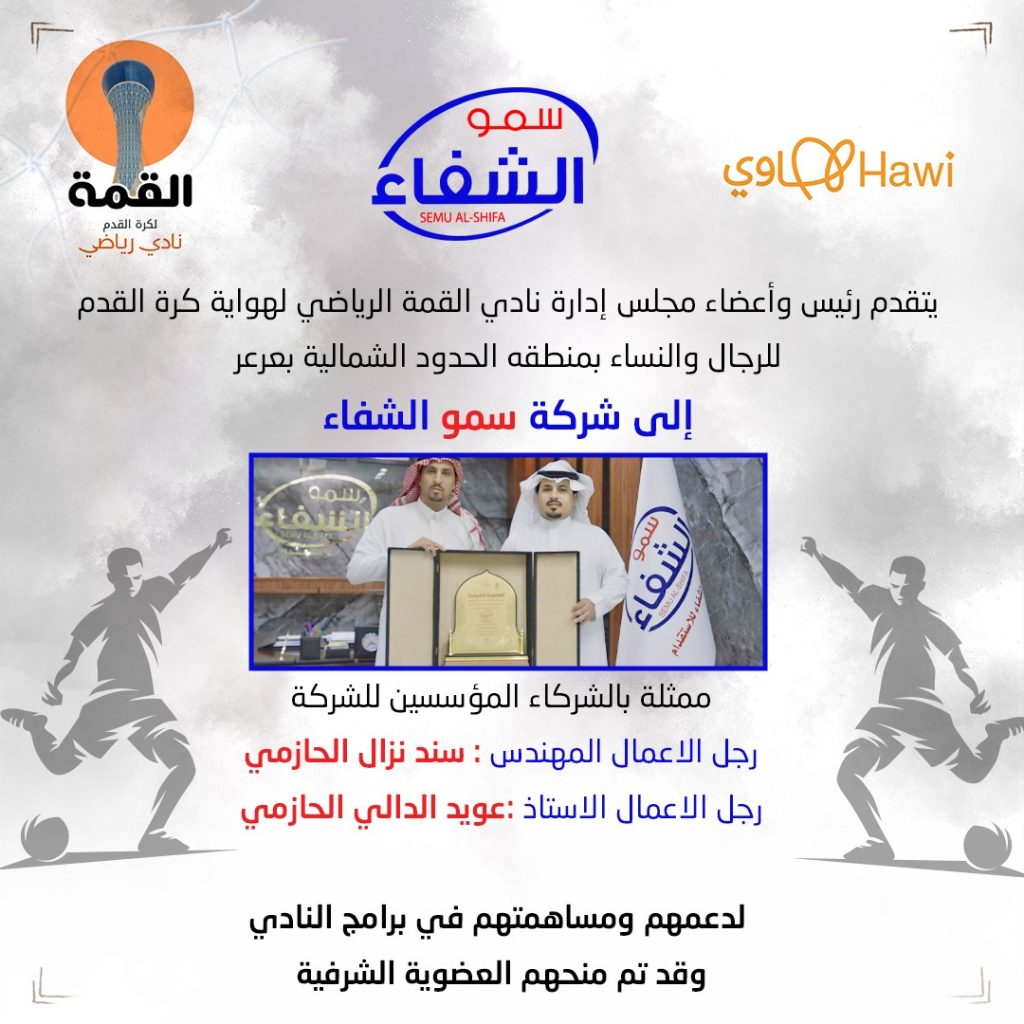 قامت شركة سمو الشفاء ممثله بالشركاء المؤسسين رجل الأعمال المهندس سند نزال الحازمي ورجل الأعمال الأستاذ عويد الدالي الحازمي بدعم برامج نادي القمة الرياضي بمنطقة الحدود الشمالية وقد ثمن رئيس النادي الأستاذ يوسف العنزي هذا الدعم وقدم العضوية الشرفية لهم بهذه المناسبة