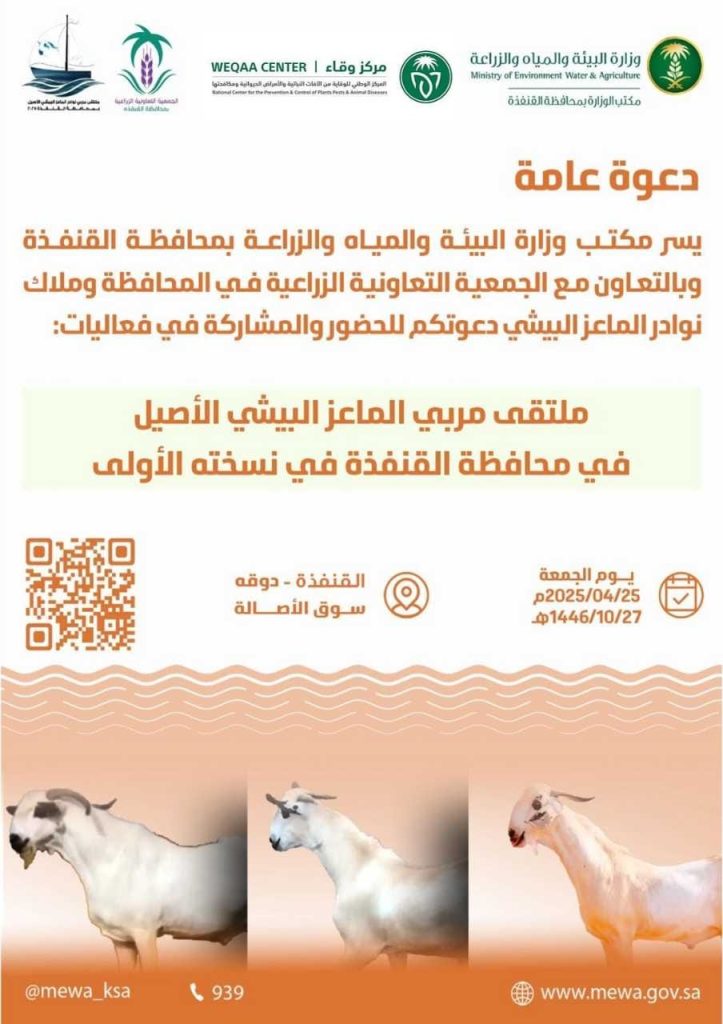وأكد مدير مكتب الوزارة بمحافظة القنفذة أن تنظيم هذا الملتقى يأتي ضمن جهود الوزارة لدعم التنمية الزراعية المستدامة والحفاظ على السلالات المحلية الأصيلة، التي تُعد ركيزة مهمة من التراث الزراعي للمملكة، مشيرًا إلى أن الحدث من المتوقع أن يستقطب عددًا كبيرًا من ملاك الماعز والمهتمين من مختلف مناطق المملكة، مما يعزز من مكانة القنفذة كمركز نشط للأنشطة الزراعية والثقافية.