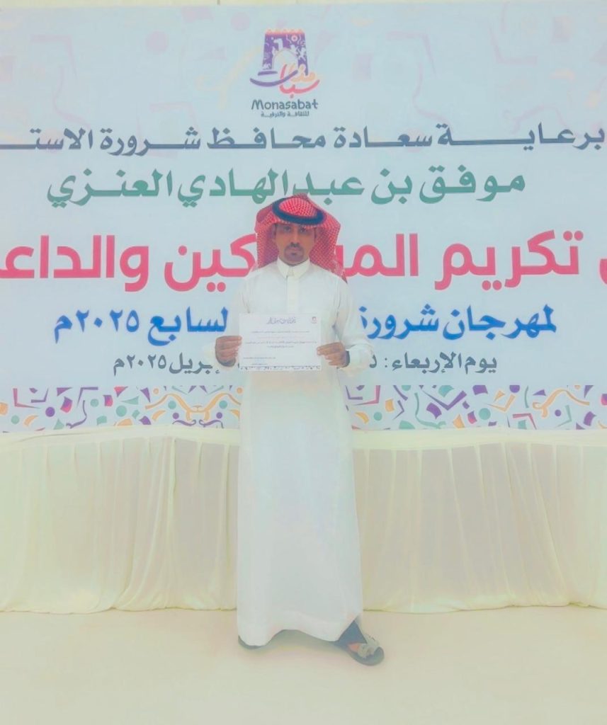 تم تكريم نائب رئيس مجلس إدارة فريق صدى التطوع الإعلامي، وصحيفة صدى نيوز إس، نايف عمر الصيعري من قبل محافظ شرورة سعادة الأستاذ موفق بن عبدالهادي العنزي ورئيس مجلس إدارة جمعية مناسبات للثقافة الترفية الأستاذ محمد بن عوض الصيعري وذلك لدعم مهرجان شرورة الشتوي السابع لعام 2025 مما كان له الأثر الكبير في نجاح المهرجان بذن الله تعالى يكون مهرجان القادم الثامن أجمل بذن الله تعالى
