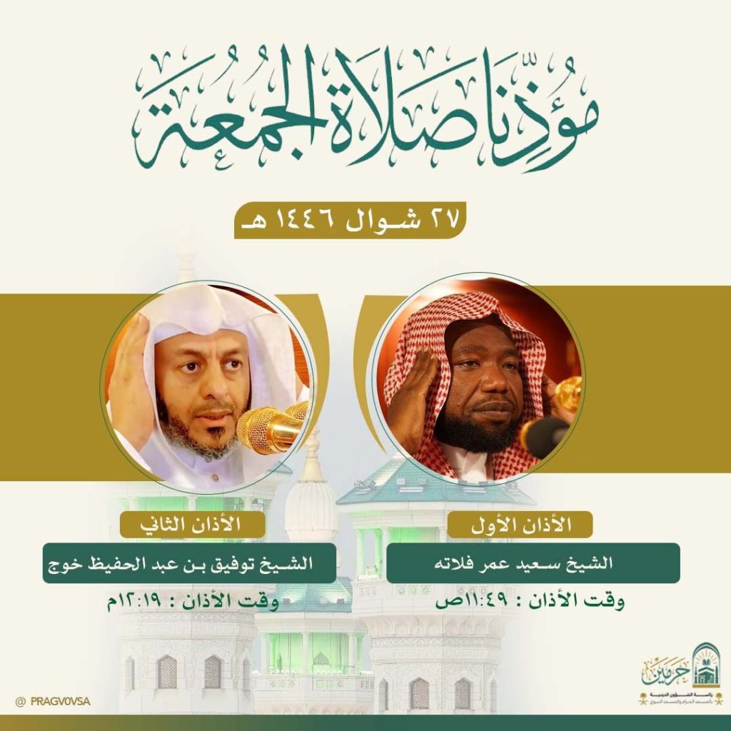 أوضحت رئاسة الشؤون الدينية بالمسجد الحرام والمسجد النبوي عن أسماء المؤذنين لصلاة الجمعة، الموافق 27 شوال 1446هـ، وذلك في إطار جهودها المستمرة لتنظيم أوقات الصلاة وإعلام الزوار والمصلين بمواعيد الأذان والمؤذنين المعنيين.