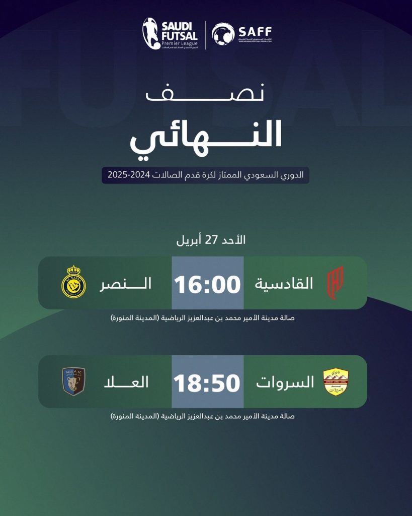 وتُلعب الأحد مباريات الدور نصف النهائي حيث يلتقي فريقا القادسية والنصر، والسروات مع العلا، وتقام المباراتين على صالة مدينة الأمير محمد بن عبدالعزيز الرياضية في المدينة المنورة.