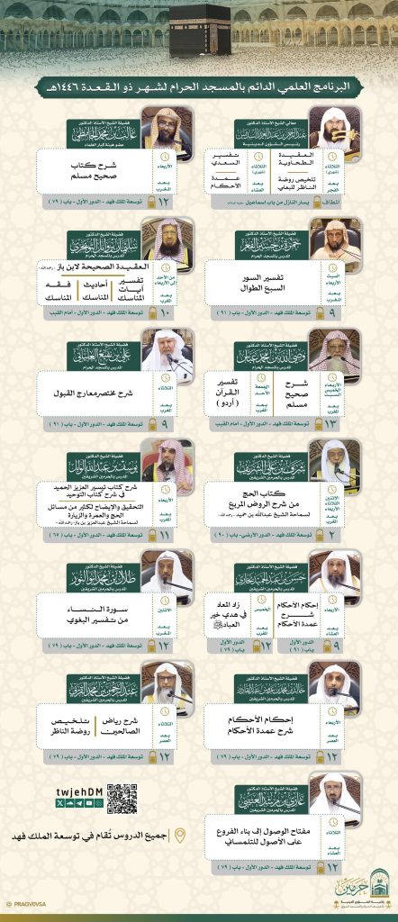 أوضحت رئاسة الشؤون الدينية بالمسجد الحرام والمسجد النبوي البرنامج العلمي الدائم في المسجد الحرام لشهر ذي القعده 1446هـ، ضمن جهودها المستمرة في نشر العلم الشرعي وتعزيز الوعي الديني لدى زوار وقاصدي بيت الله الحرام.
