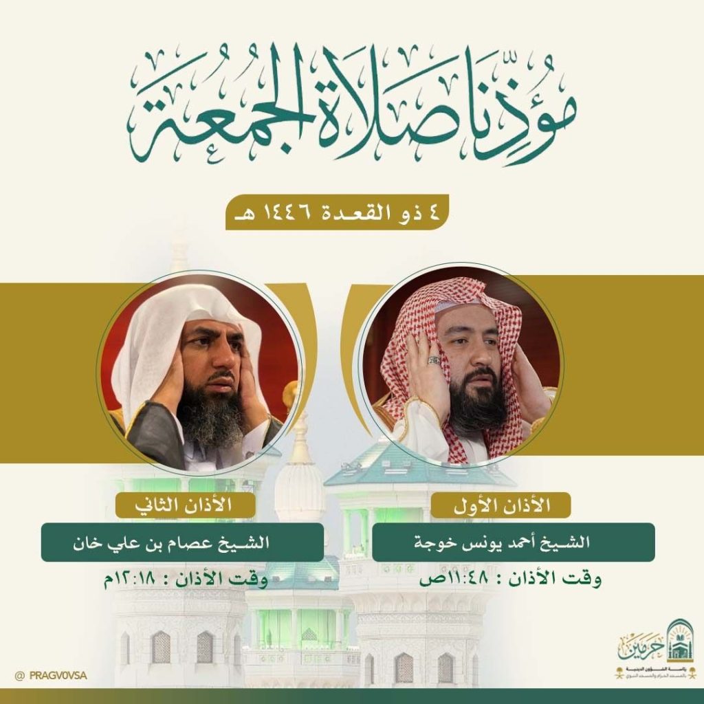 أوضحت رئاسة الشؤون الدينية بالمسجد الحرام والمسجد النبوي أسماء المؤذنين لصلاة الجمعة الموافق 4 ذي القعدة 1446هـ، وذلك ضمن جهودها المستمرة في تنظيم أوقات الصلاة، وإعلام قاصدي وزوّار الحرمين الشريفين بمواعيد الأذان والمؤذنين المكلفين.