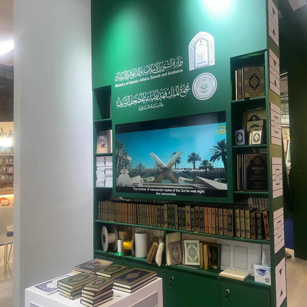 وتقدّم الوزارة من خلال ركنها في المعرض صورة حيّة لجهود المملكة في خدمة القرآن الكريم ونشر قيم الوسطية والاعتدال، حيث يستعرض الركن إصدارات مجمع الملك فهد لطباعة المصحف الشريف بالمدينة المنورة، متضمنًا نسخًا من المصحف الشريف بمختلف الأحجام، وترجمات معانيه إلى أكثر من 77 لغة عالمية، إلى جانب عرض تعريفي تفصيلي لآلية طباعة المصحف الشريف والمراحل التقنية الحديثة التي يمر بها داخل المجمع، بهدف تعريف الزوار بعناية المملكة بكتاب الله وحرصها على نشره في جميع أنحاء العالم.
