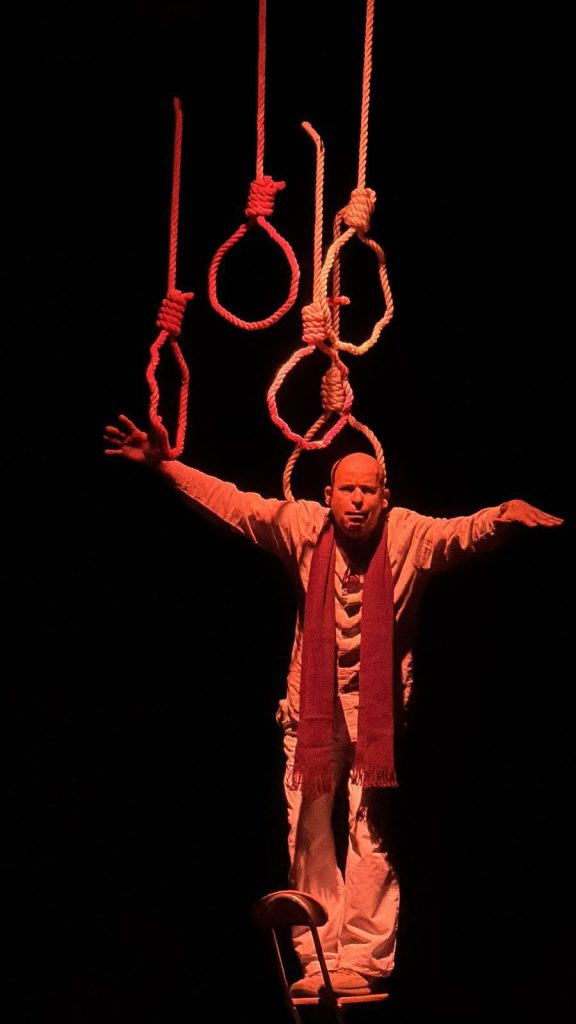 حيث قدمت المسرحية على المركب الثقافي بمدينة تطاوين ضمن ربيع المونودراما بتطاوين حيث يشارك في المهرجان حوالي 12 دولة عربية واجنبية وقد اشاد كثير من الحضور على جمالية العرض المسرحي من حيث انتقاء النص الملي بالمفردات والكلمات التي تلامس جميع المتلقيين واشادوا باجادة العمل الاخراجي واعتمادة على قطع بسيطة للديكور ومجموعة من المشانق التي وضفت بصورة جميلة.