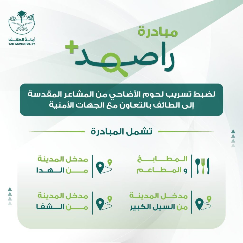 أطلق أمين محافظة الطائف المهندس عبدالله بن خميس الزايدي مبادرة راصد+ لمنع تسرب أي لحوم من المشاعر المقدسة، وذلك ضمن تكثيف الحملات ونقاط التفتيش على مداخل المحافظة.