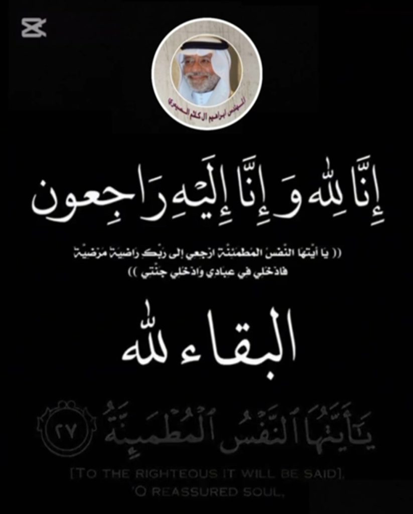 نشاطركم الأحزان، للفقيده الرحمة ولكم من بعدها طول البقاء، إنّا لله وإنّا إليه راجعون. نعزيكم بوفاة فقيدتكم (أم إبراهيم) ،حرم الشيخ عبدالرحمن بن إبراهيم آل كلثم الصيعري رحمه الله* المغفور لها بإذن الله تعالى، تغمّده الله بواسع رحمته وأسكنه فسيح جناته، وألهمكم وذويكم الصبر والسلوان، إنّا لله وإنّا إليه راجعون.